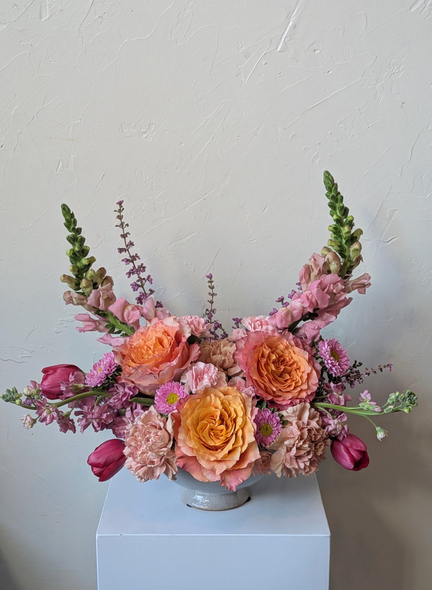 This garden inspired flower arrangement uses hand picked seasonal blooms, herbs and greenery, many that are grown on-site on my own micro-farm and other CA growers. You'll receive a beautiful bouquet with a variety of blooms especially curated just for you by our experienced florists.