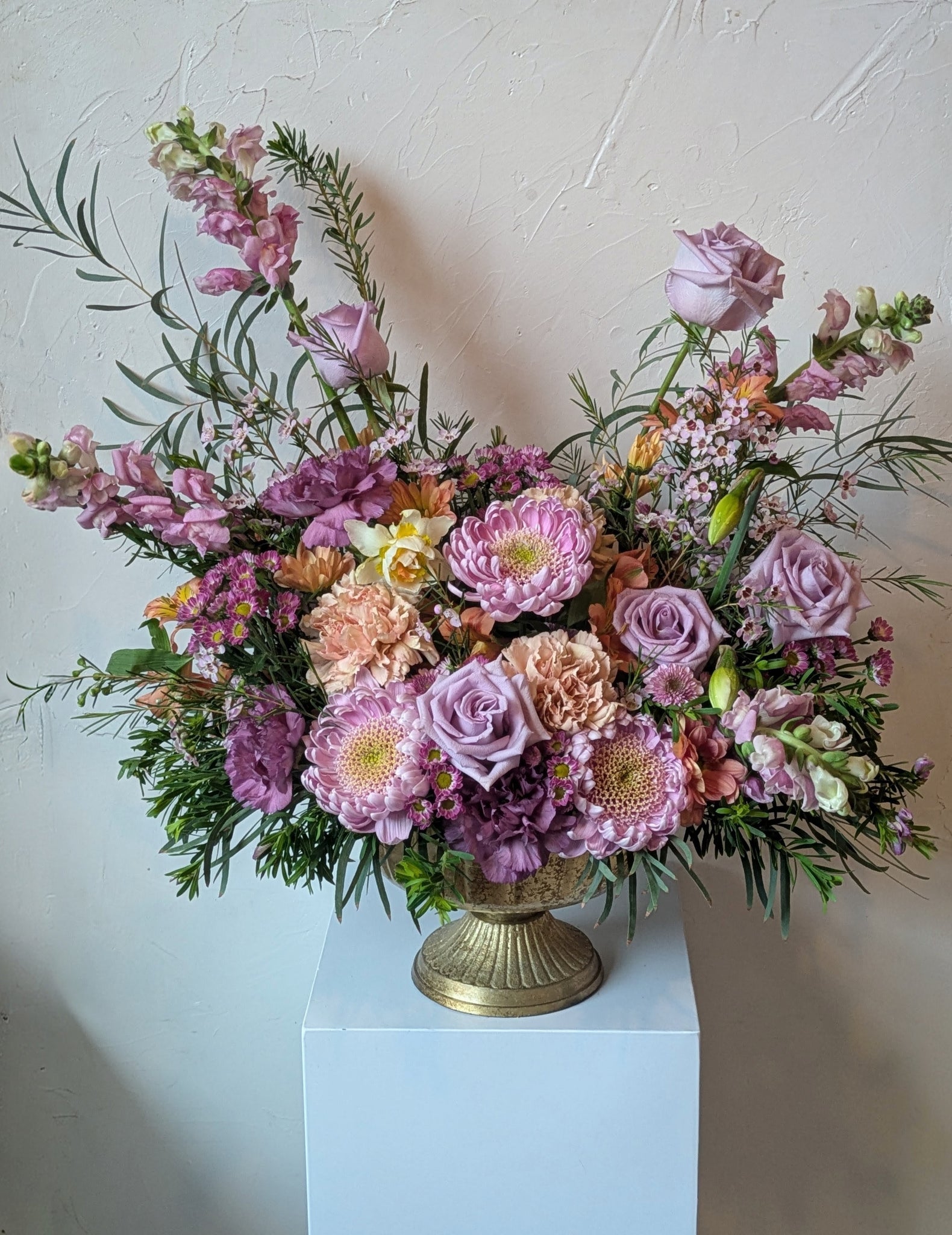 Arranged in a distressed gold metal compote vessel.